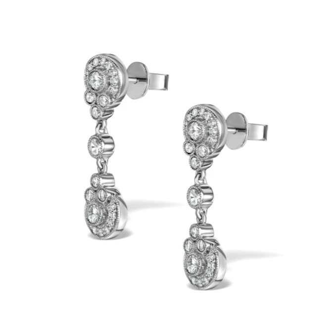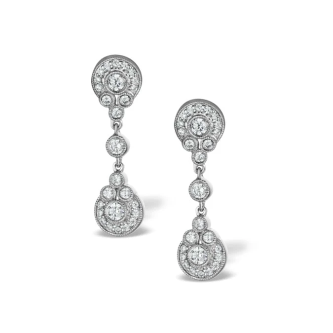 The glorious design of these Vittoria diamond drop earrings creates an effortless look of vintage decadence and luxury. Each beautiful, conflict-free H/Si quality stone is handpicked for perfectly matching colour and clarity to create unrivalled sparkle. These earrings would be the perfect gift for a bride on her wedding day or a glamorous accessory worn for a red carpet occasion.